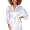 Elegante vestaglia in raso, in colore bianco perla. Legato in vita. Il taglio con maniche a 3/4, attualmente alla moda, è decorato con pizzo floreale ai polsi. Una proposta perfetta per un regalo ad una persona cara.