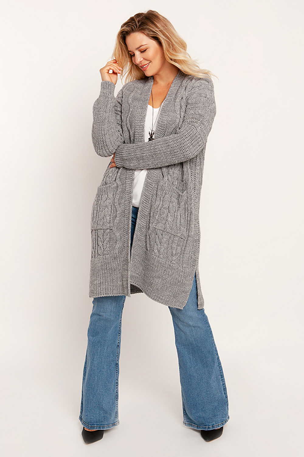 Impressionante cappotto di maglione con tasche, senza chiusura. Decorato con un interessante motivo a quadri. Spacchi laterali per il tuo comfort. Una proposta elegante per i giorni freddi per le donne che apprezzano il comfort. Qualità premium.