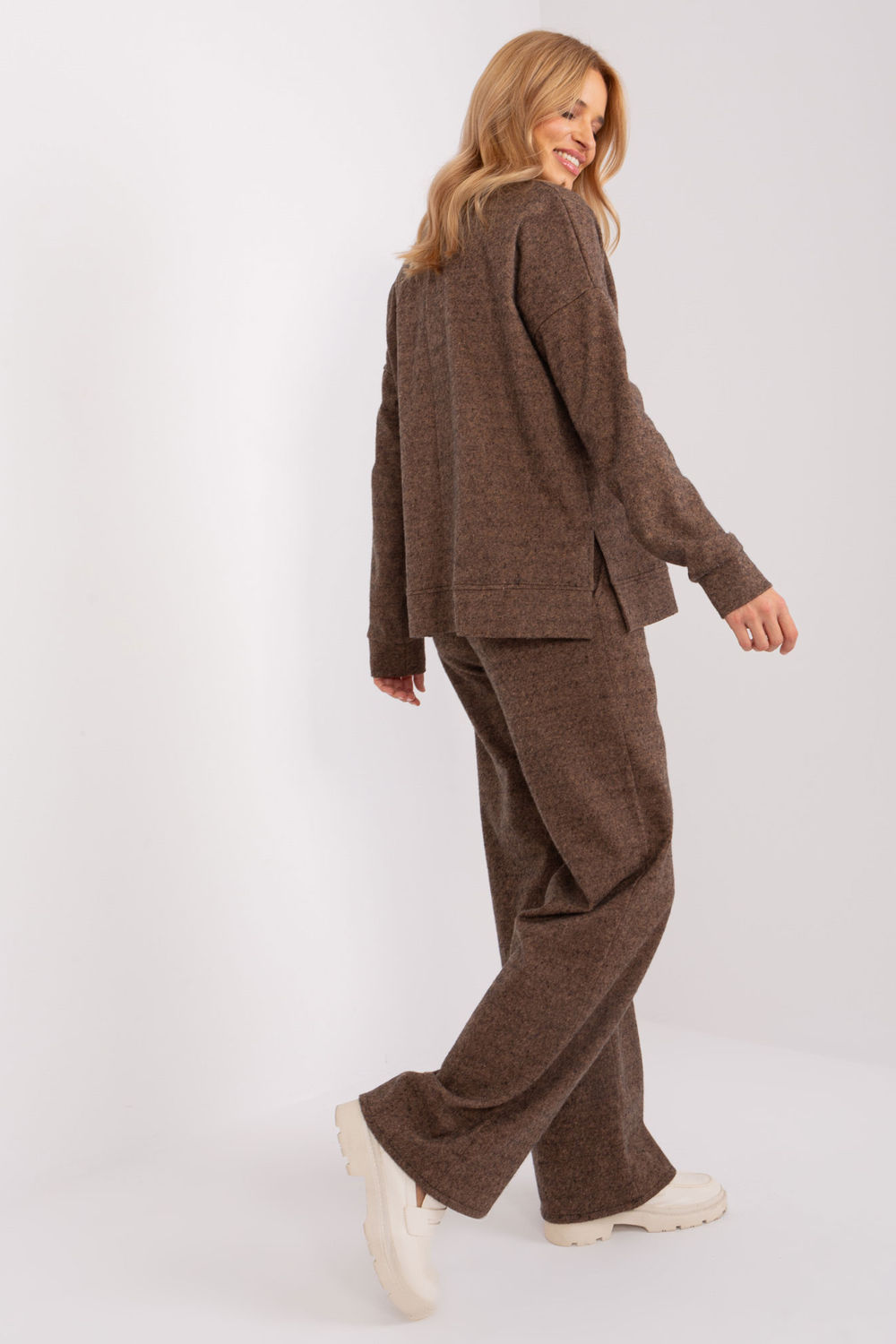 Set casual da donna composto da camicetta e pantaloni. Camicetta aderente con maniche lunghe e scollatura a girocollo. Pantaloni lunghi a gamba larga con elastico e laccetto in vita.