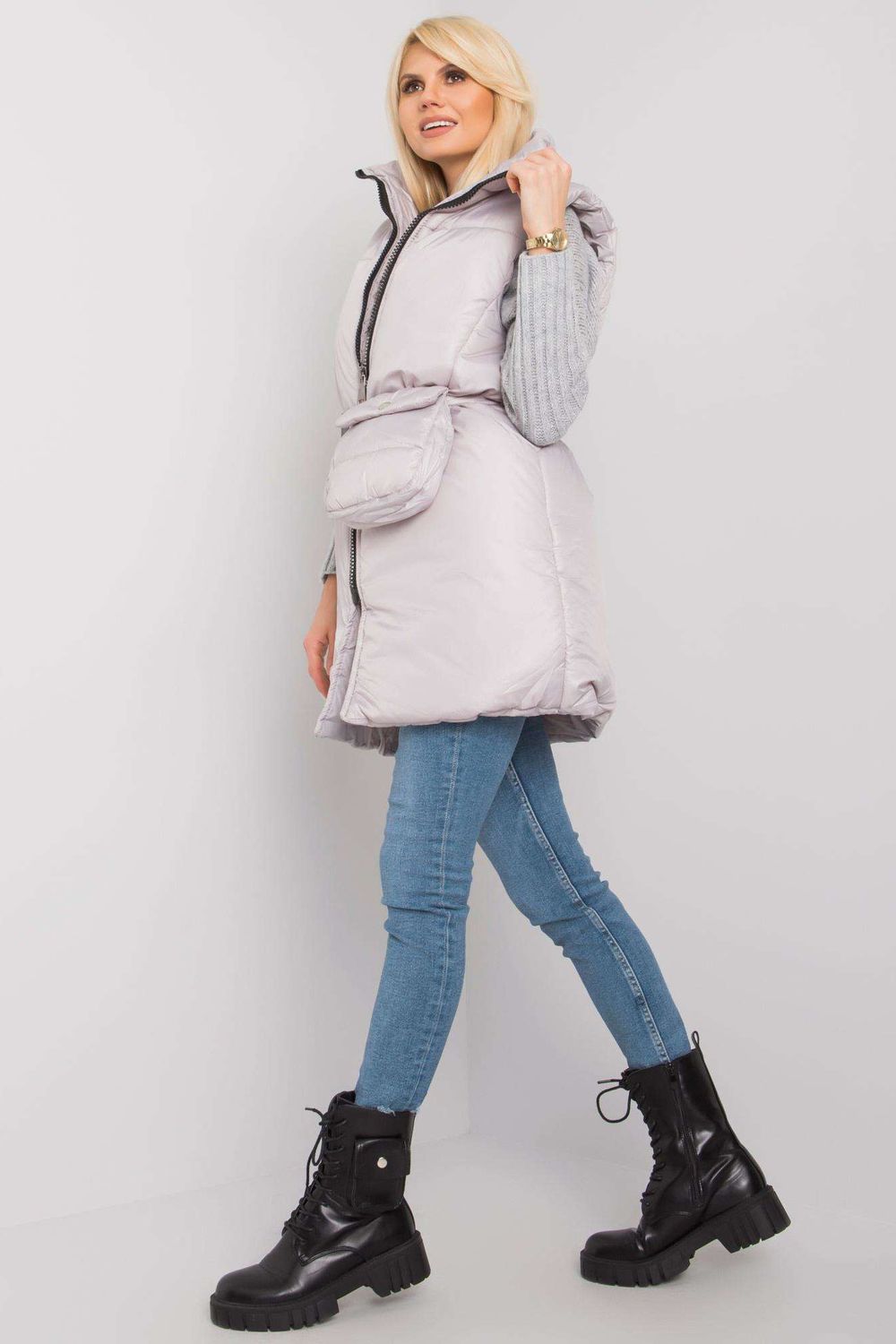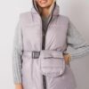 Gilet in piuma grigio chiaro con zip. Gilet con tasche a scomparsa. Cintura con custodia inclusa.
