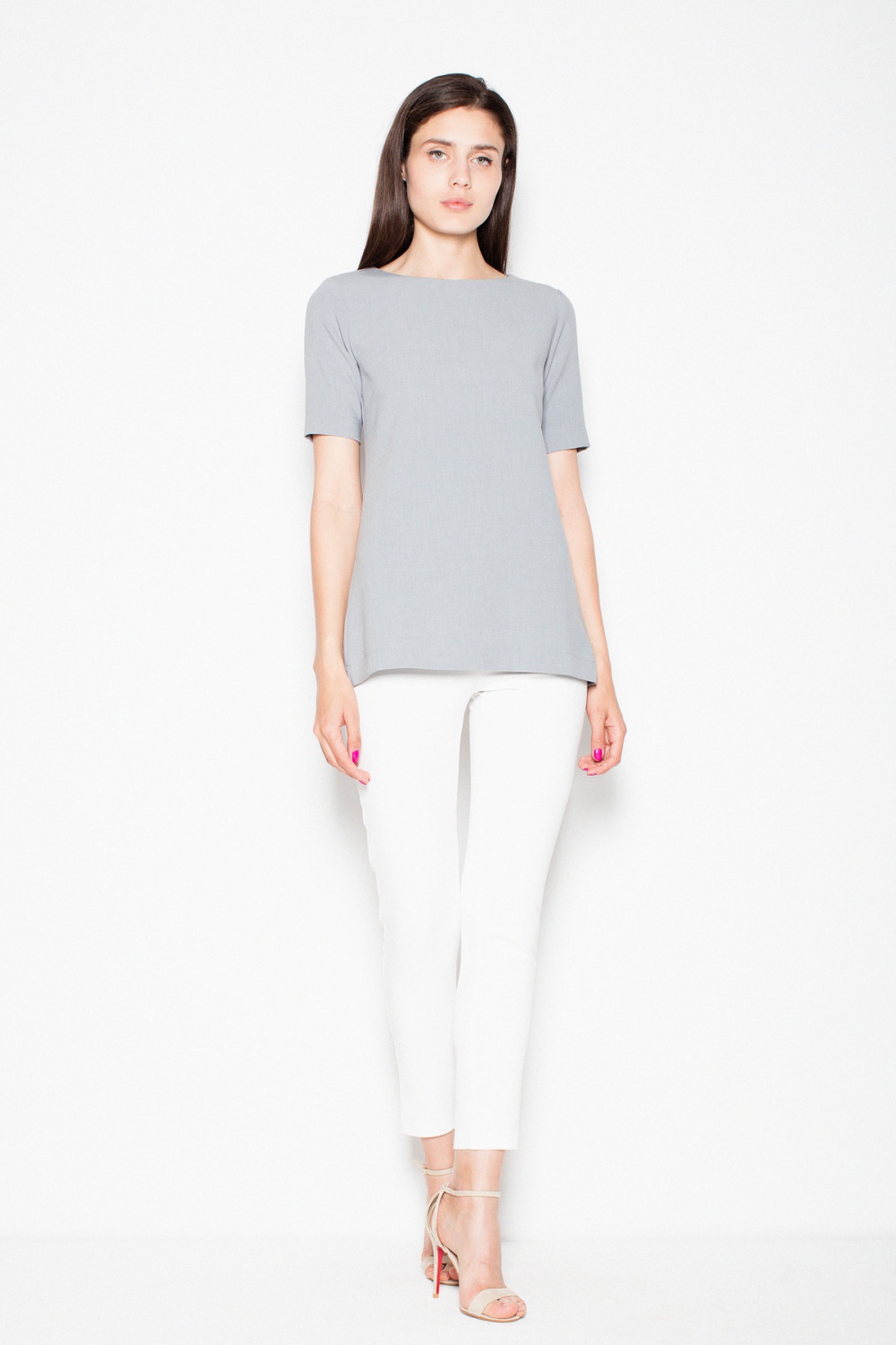 Camicetta a maniche corte con un taglio allungato. Impressionanti ritagli quadrati sul retro. Perfetto con i pantaloni abbinati.