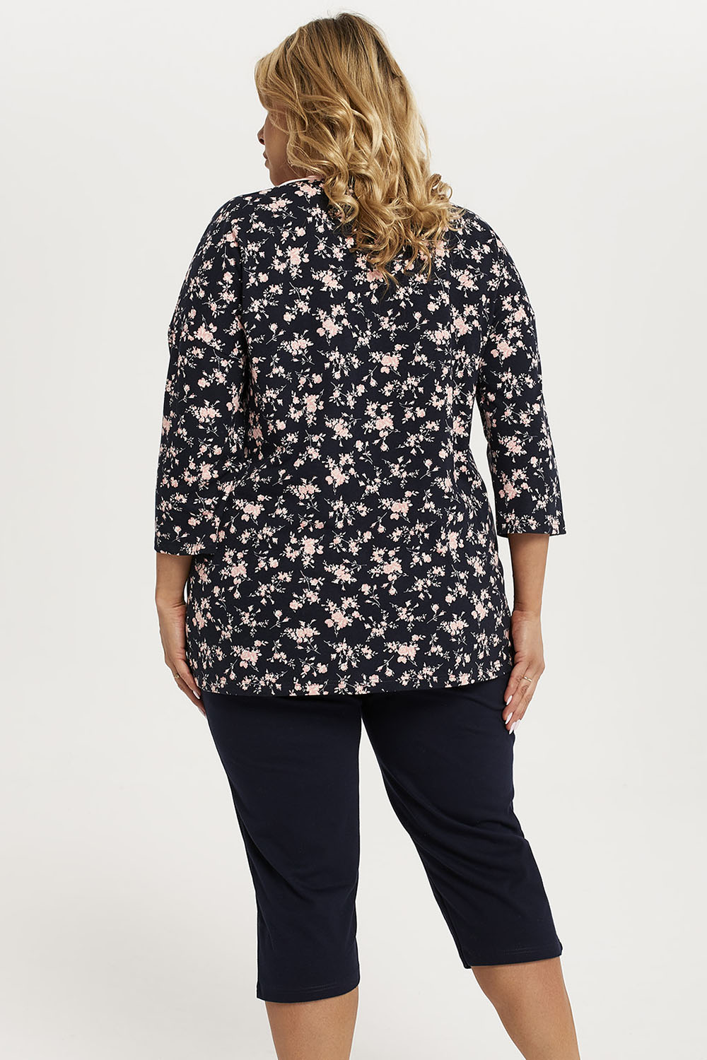 Pigiama da donna aderente composto da camicetta e pantaloni. Camicetta con maniche a 3/4 e scollatura rotonda. Pantaloni a 3/4 con tasche a filetto sui lati.