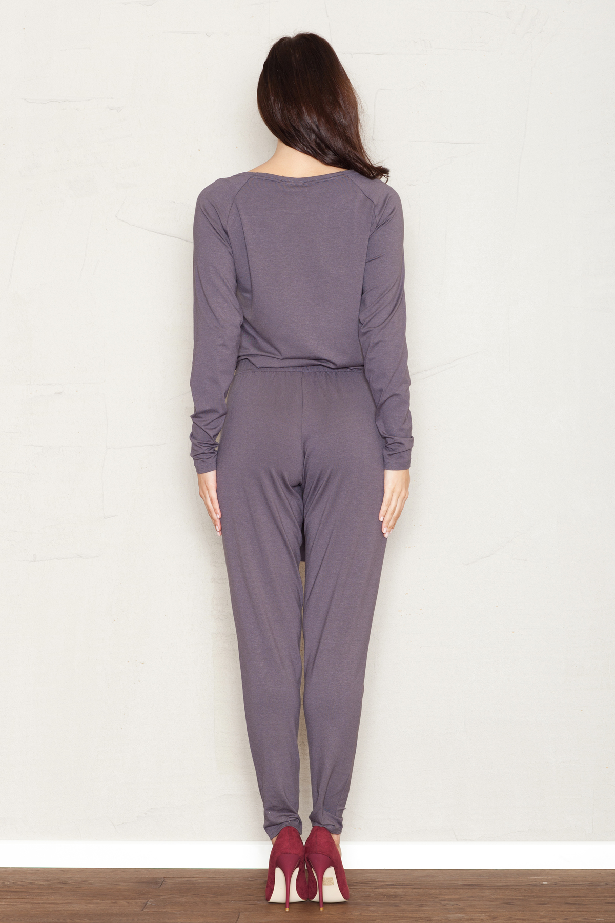 Una tuta alla moda ed estremamente femminile realizzata in morbida viscosa con elastan. Il fondo consiste in pantaloni lunghi con tasche. Le gambe sono affusolate, con un elastico in vita e una cravatta giocosa. Il top è una camicetta più ampia con maniche lunghe e una scollatura a metà. L’insieme è un’ottima soluzione sia per una passeggiata, sia per un weekend fuori città.