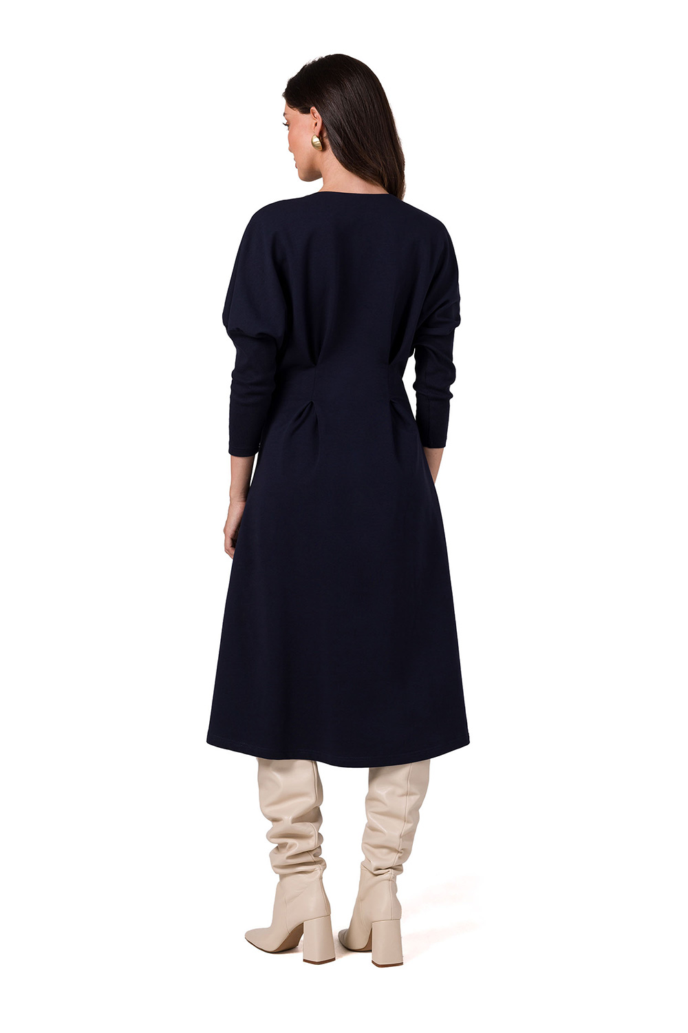 Questo delizioso abito è una combinazione di comfort e stile. Realizzato in un morbido tessuto a maglia, accentua splendidamente il punto vita grazie alle pinces modellanti in vita. Le maniche lunghe a pipistrello conferiscono eleganza, mentre la scollatura con spacco aggiunge delicatezza. L’ampia gonna e le tasche laterali garantiscono il comfort. L’abito ha una lunghezza sotto il ginocchio, che lo rende adatto a molte occasioni. Si tratta di un modello unico, disegnato e prodotto in Polonia, che attirerà sicuramente l’attenzione.